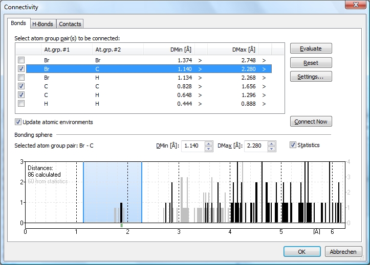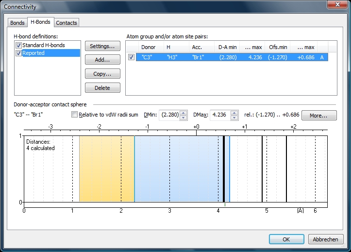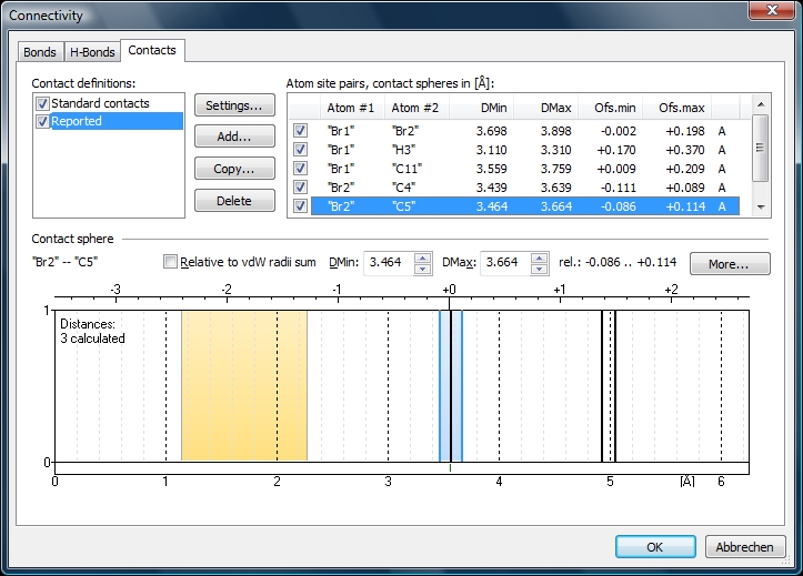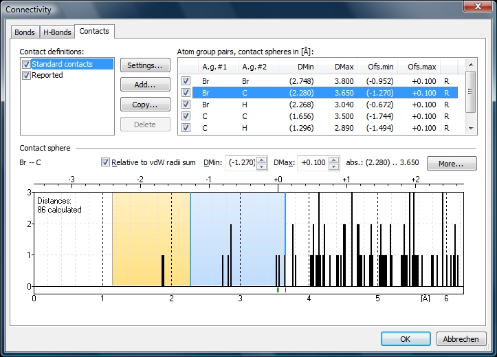 The second screen shot shows the standard (non-bonding) contacts, which are compiled on atom group level -- as the bond groups on the "Bonds" page do. The pair C--Br is highlighted, the histogram shows the distances between all C and Br atoms in the current compound. The light blue rectangle describes the contact sphere and begins on the upper boundary of the strong bonding sphere and ends at the sum of van der Waals radii plus 0.1 Angstroem. Boundaries can be defined in absolute (Angstroem) values or relative to van der Waals radii sums.