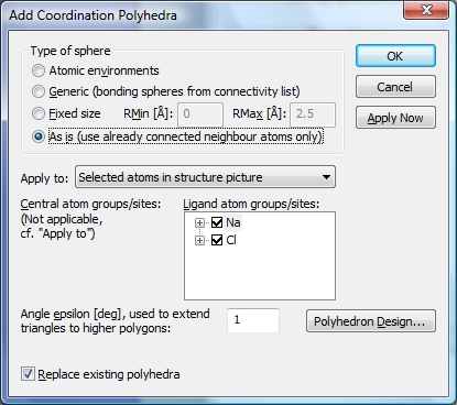 The picture above shows in the left part the result of a conventional creation of a coordination polyhedra (one of the three options "atomic environment", "generic", or "fixed-size sphere") that automatically creates the missing atom(s) (here: one Cl atom outside the unit cell) with the expected NaCl6 octahedron, whereas the option "as is" creates a pyramid from the existing five Cl neighbours only.