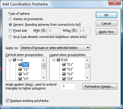 The generation of coordination polyhedra works with completed as well as incomplete coordination spheres. That means missing ligand atoms will be supplemented if necessary. Generic spheres are used to create ligand atoms which are bonded to the central atom. The dimensions of these spheres are defined in the connectivity list and vary thus from atom group (atom type) pair to atom group pair. The polyhedra procedure does not generate ligand atoms that are selected in the list Ligand atoms but are not selected as bonded in the connectivity list. If fixed spheres are used, even such ligand atoms will be created that are not defined as bonded in the connectivity list.