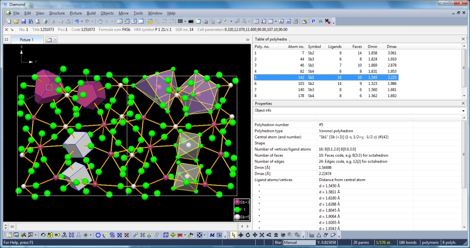 with the structure picture of COD-9013529.diamdoc: The first page of the "Voronoi Polyhedra" dialog shows a list of all atom sites, which you can use to choose the atoms in the structure picture to become center(s) of Voronoi polyhedron/a. Or you choose "Selected atoms in structure picture", provided at least one atom in the structure picture has been selected before calling the dialog. The middle part of the dialog page refers to the polyhedron shape and is similar to the shape and design of (conventional) coordination polyhedra that you already know from older Diamond versions. In the section concerning the atoms in the neighbourhood you define if and how far to create neighbouring atoms (that means all or certain atoms of the Dirichlet domain) and if and how to connect the central atom with the neighbouring atoms.
