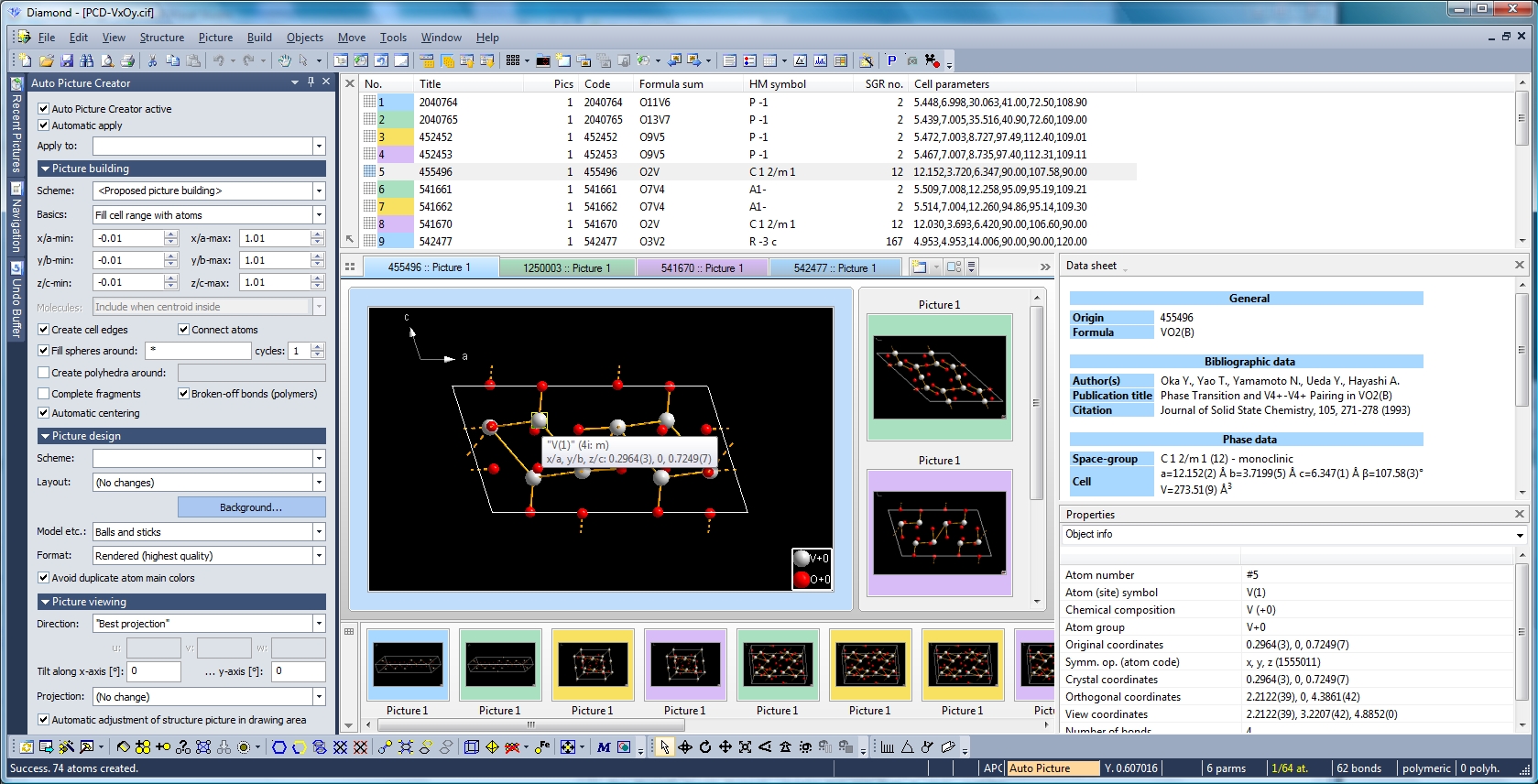• "Atom list": Hierarchical list of atom groups, atom sites, and created atoms of structure picture,