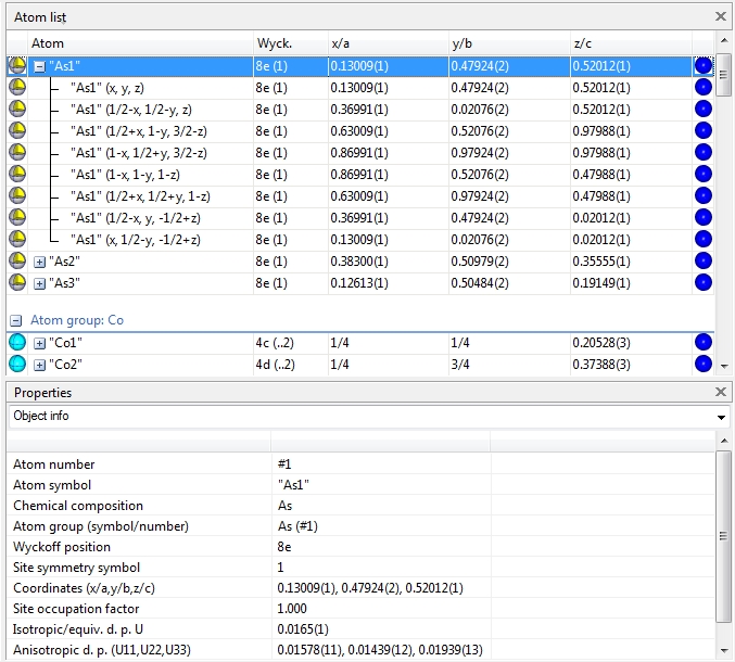 Screenshot of atom list of COD:1500005 with atom site 'As1' highlighted and properties
