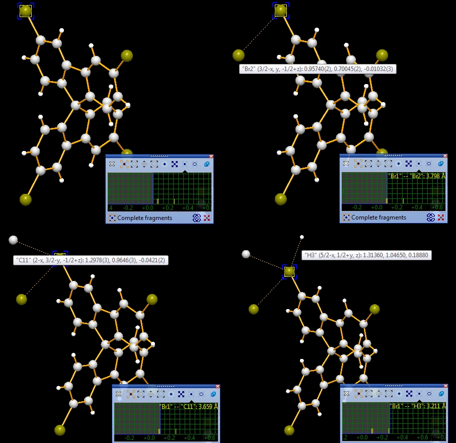 the fifth and the sixth picture): Note: Screenshots have been made with version 4 of Diamond. Expand via contactsIn the following example, we first examine a contact sphere, then try out to find subsequently neighbouring molecules via these contacts. We open the example with one molecule of COD:1501635 from COD-1501635-molecule.diamdoc, click on the "Br1" atom at (x,y,z) (in the top left when viewed along -a-axis), and run the command "Tools"/"Mouse Wheel Action"/"Expand via Contacts". The blue blinking marker appears and the mouse wheeling control window opens for "Expand via contacts" mode. There are three atoms in the neighbourhood of "Br1", not more than the sum of van der Waals radii plus an offset of 0.1 Angstroem away. You get these three neighbours ("Br2", "C11", "H3") by turning a mouse wheel tick each, as the sequence of four pictures show below: