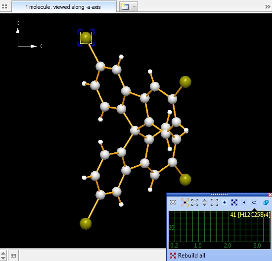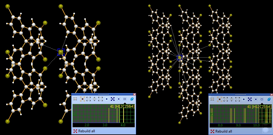 Now we make two sequences of neighbouring molecules using (a) the Br1--Br2 contact only, or (b) Br1--Br2 plus Br1--C11 contacts. To change from contact sphere evaluation (mouse wheel changes search radius) to expansion (a mouse wheel tick adds another contacted neighbouring molecule each), press the "Expand Cluster" button in the control window (see picture below).