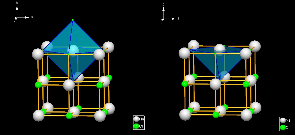 The picture above shows in the left part the result of a conventional creation of a coordination polyhedra (one of the three options "atomic environment", "generic", or "fixed-size sphere") that automatically creates the missing atom(s) (here: one Cl atom outside the unit cell) with the expected NaCl6 octahedron, whereas the option "as is" creates a pyramid from the existing five Cl neighbours only.